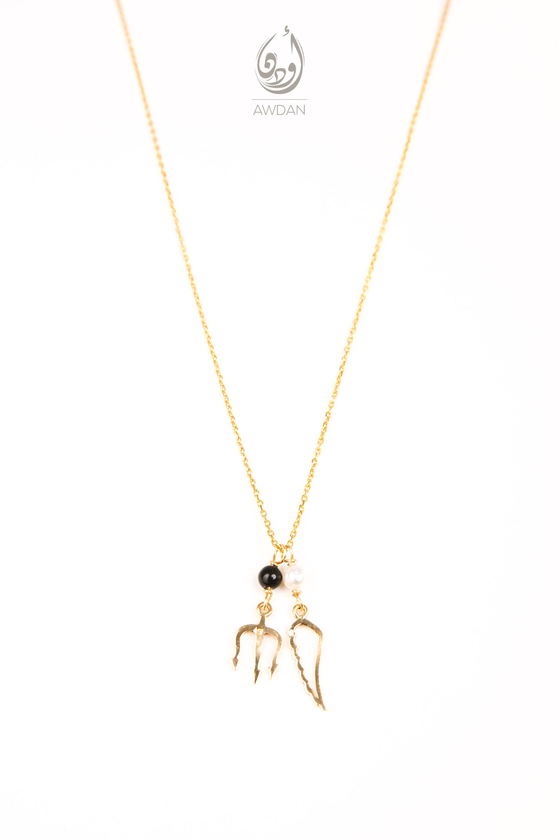 This 18k gold necklace features two pendants—a devil's fork and an angel's wing—joined together to symbolize the dual nature of humanity: the interplay between good and bad, light and dark. Crafted with precision, this piece embodies balance and complexity, offering a refined way to express the contrasting facets within us all through luxurious materials and thoughtful design.
