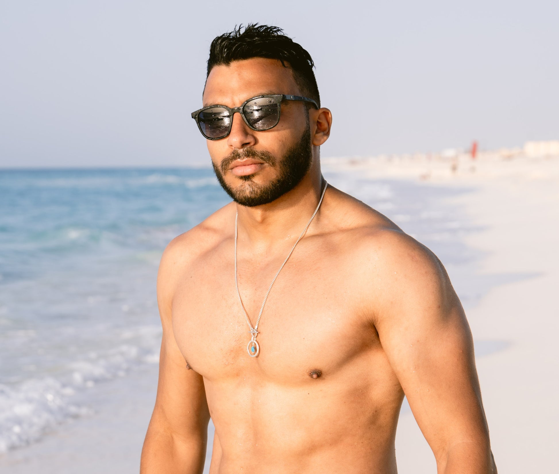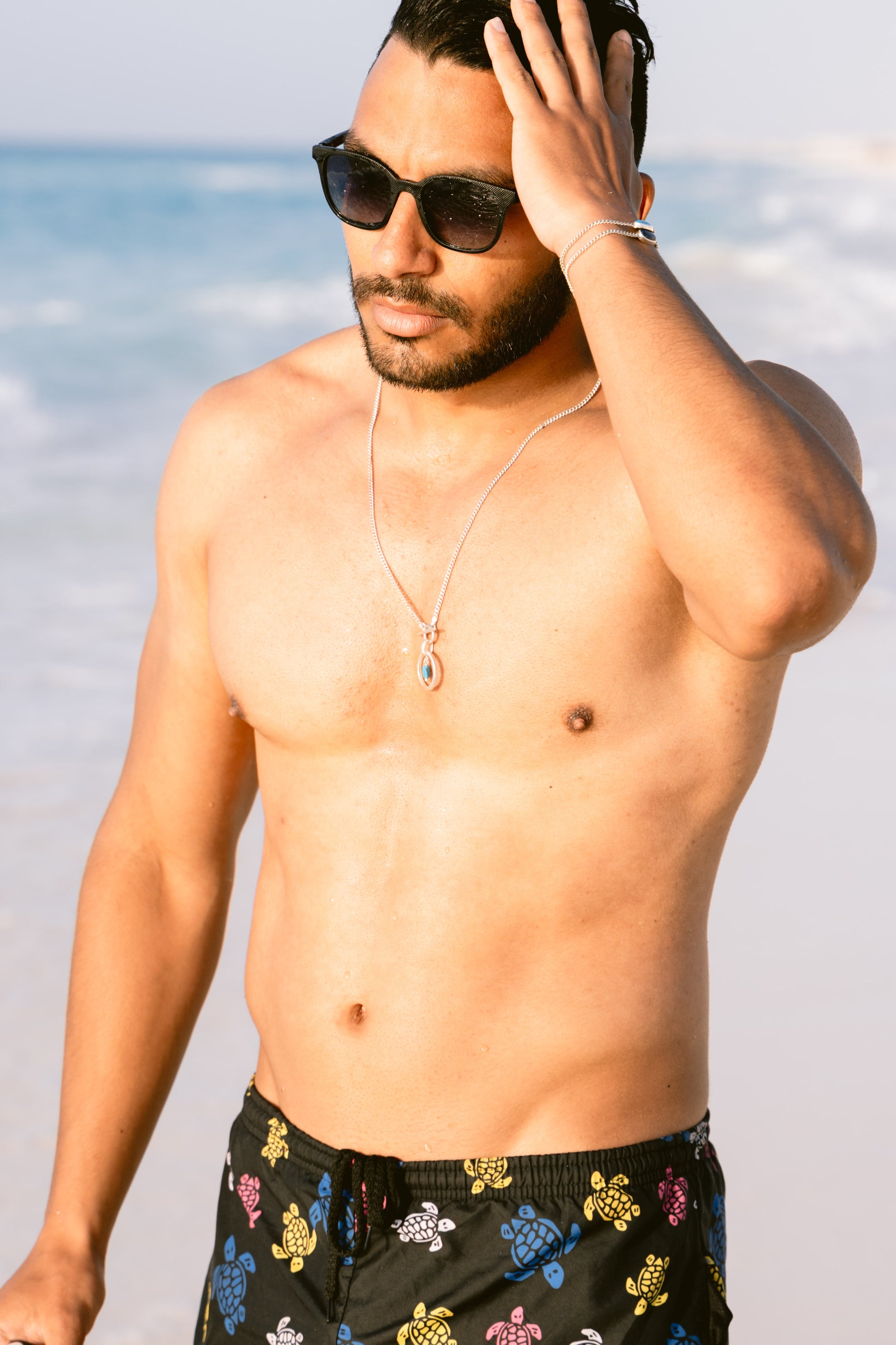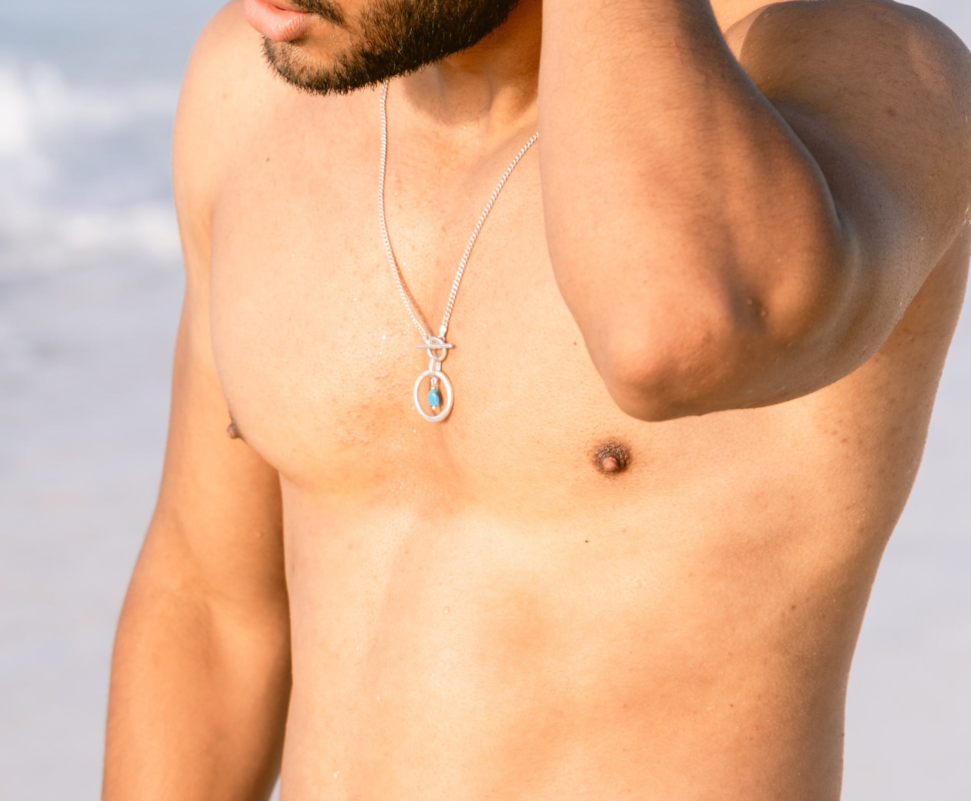 Make a splash at your next summer dinner with this playful pendant featuring a chunky turquoise bead dangling inside a sleek silver circle. Hanging from a trendy Cuban links chain with a cool front lock, it’s the perfect pop of color and style for warm evenings out.