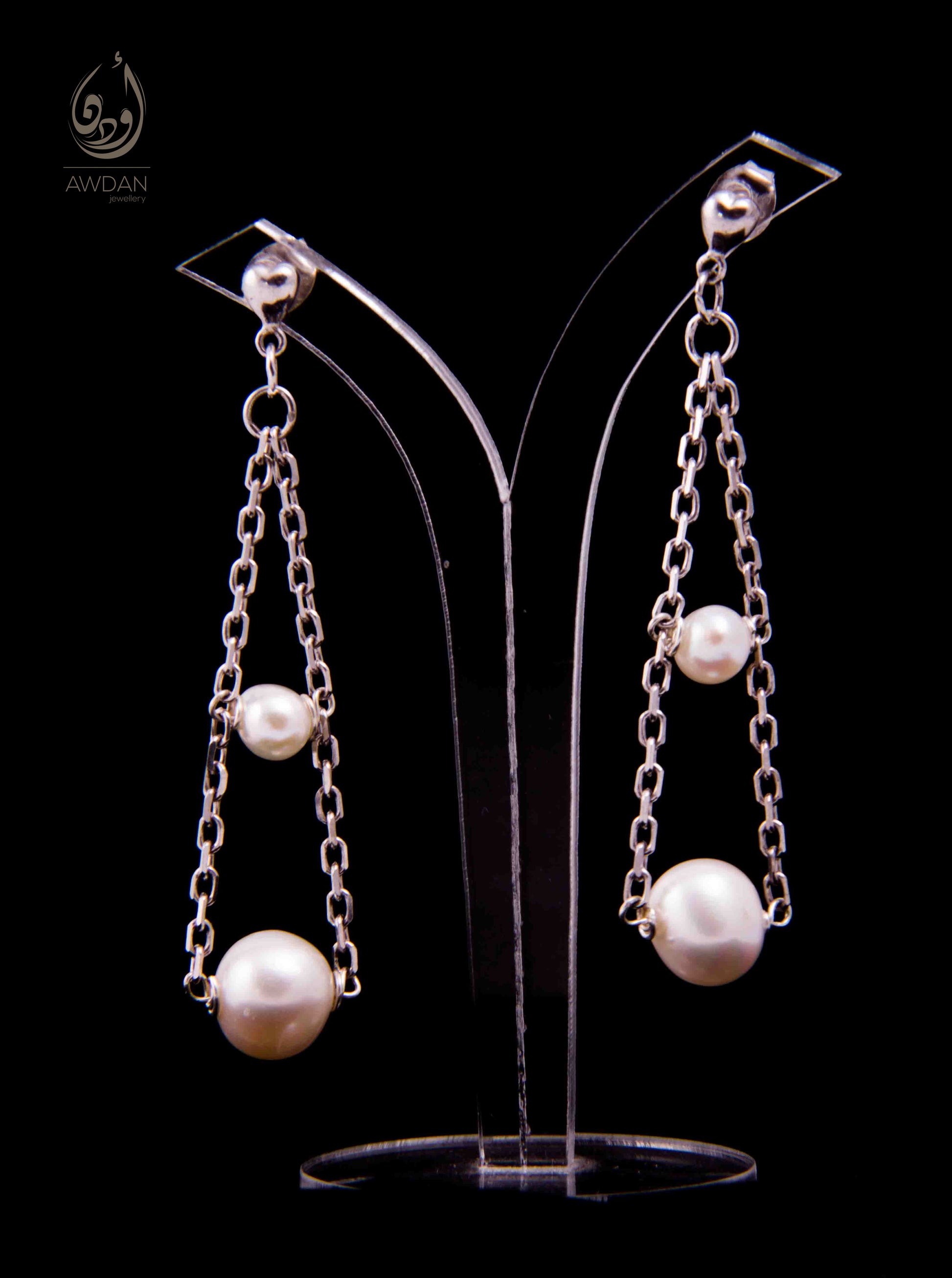 Two silver chains placed side by side, elegantly holding two pearl beads forming a stylish triangular shape. This unique design combines sophistication and modern elegance, making them a captivating accessory to elevate any outfit.