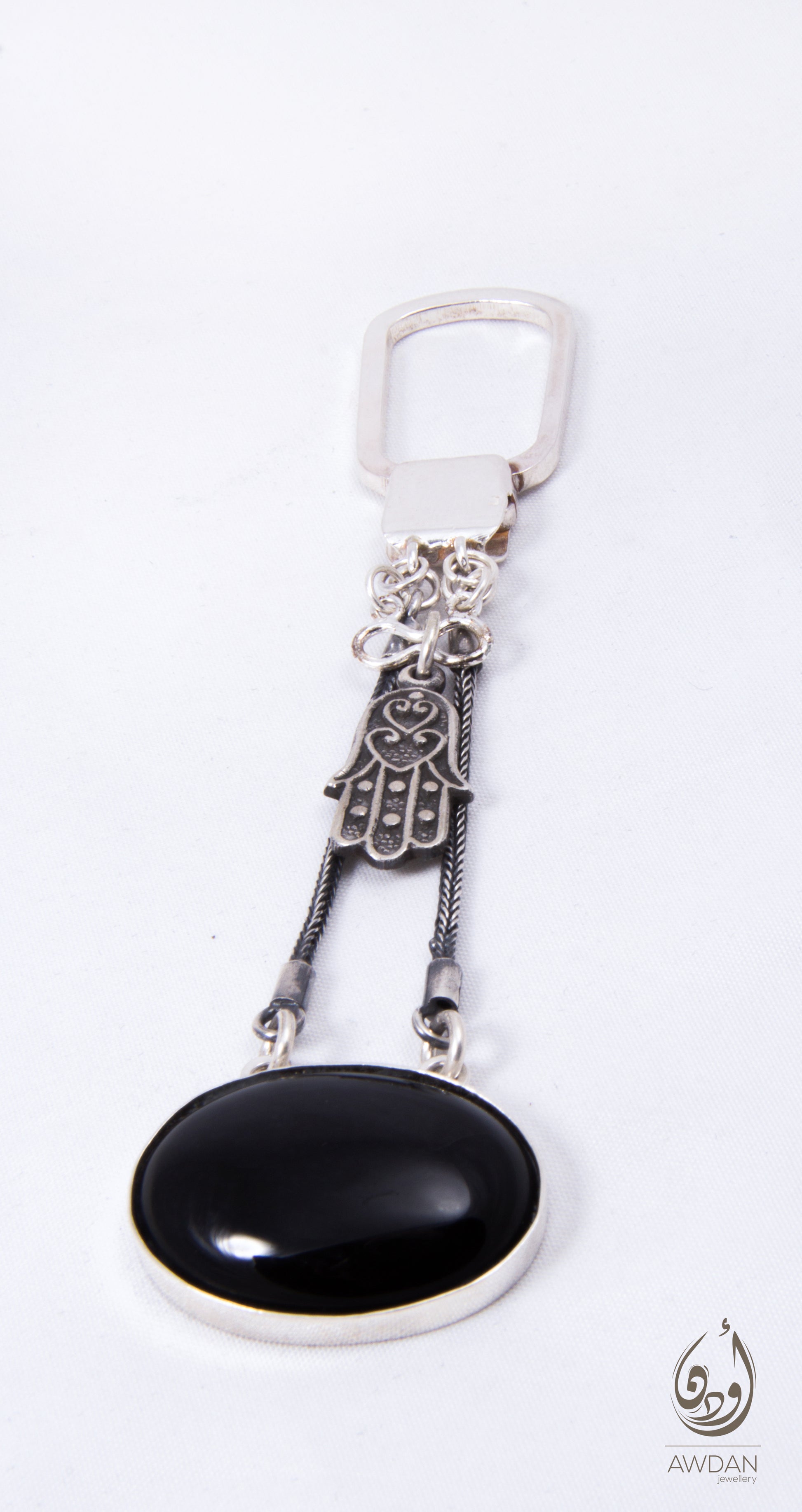This distinctive keychain features a horizontal onyx stone elegantly set in silver, suspended between two vintage-braided silver chains. Topping the design is a delicate hand charm that adds symbolic meaning and a touch of artistry. Combining classic materials with thoughtful details, this keychain is a stylish accessory that carries both beauty and significance wherever you go.