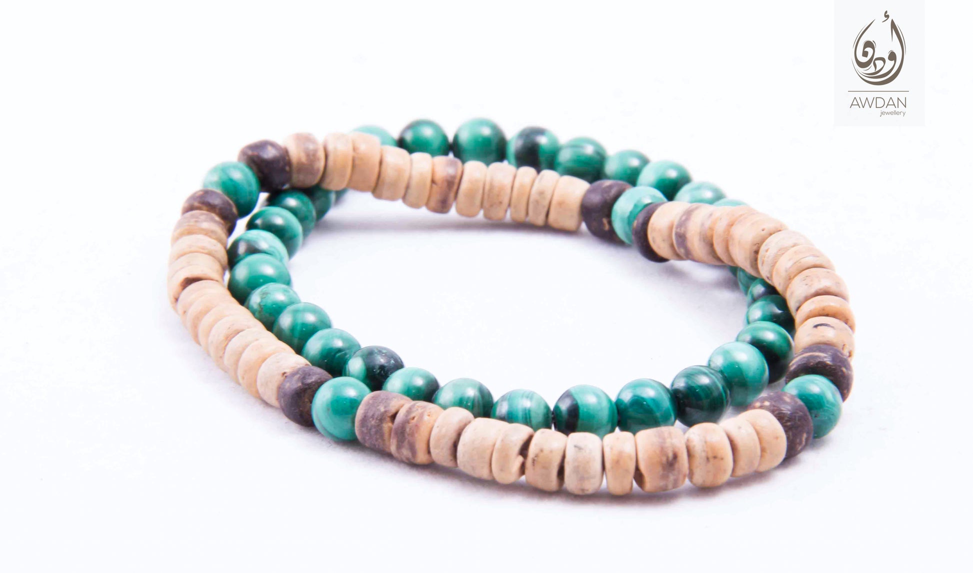This set includes two beaded bracelets—one made entirely of Malachite stone and the other combining wood with Malachite beads. These bracelets offer a natural and stylish look, perfect for adding a subtle touch of color and texture to any outfit.