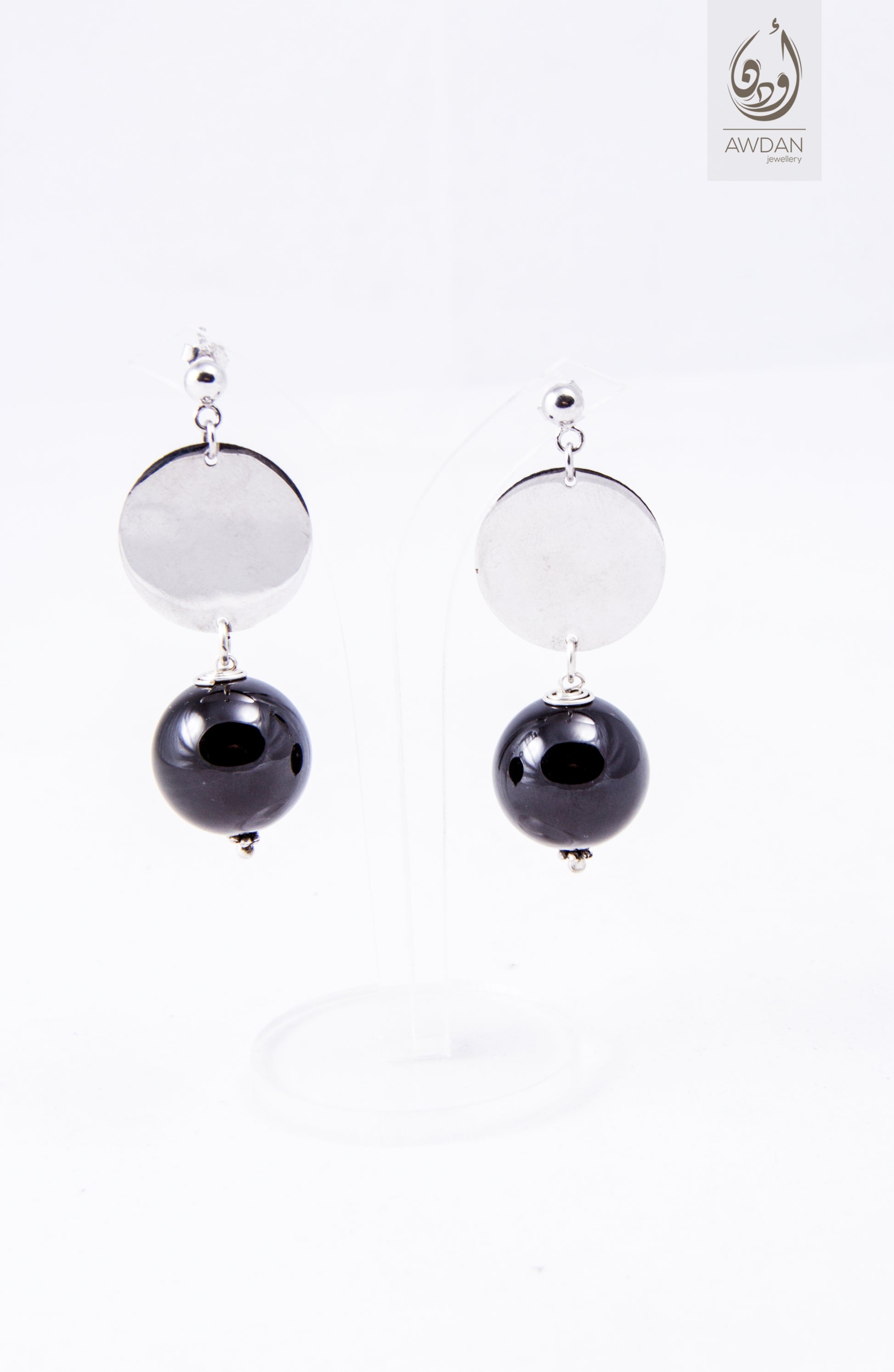 These earrings feature an ear stud design holding a coin adorned with a striking onyx bead. This combination of classic elements and bold accents creates a unique accessory that adds elegance and sophistication to any outfit.