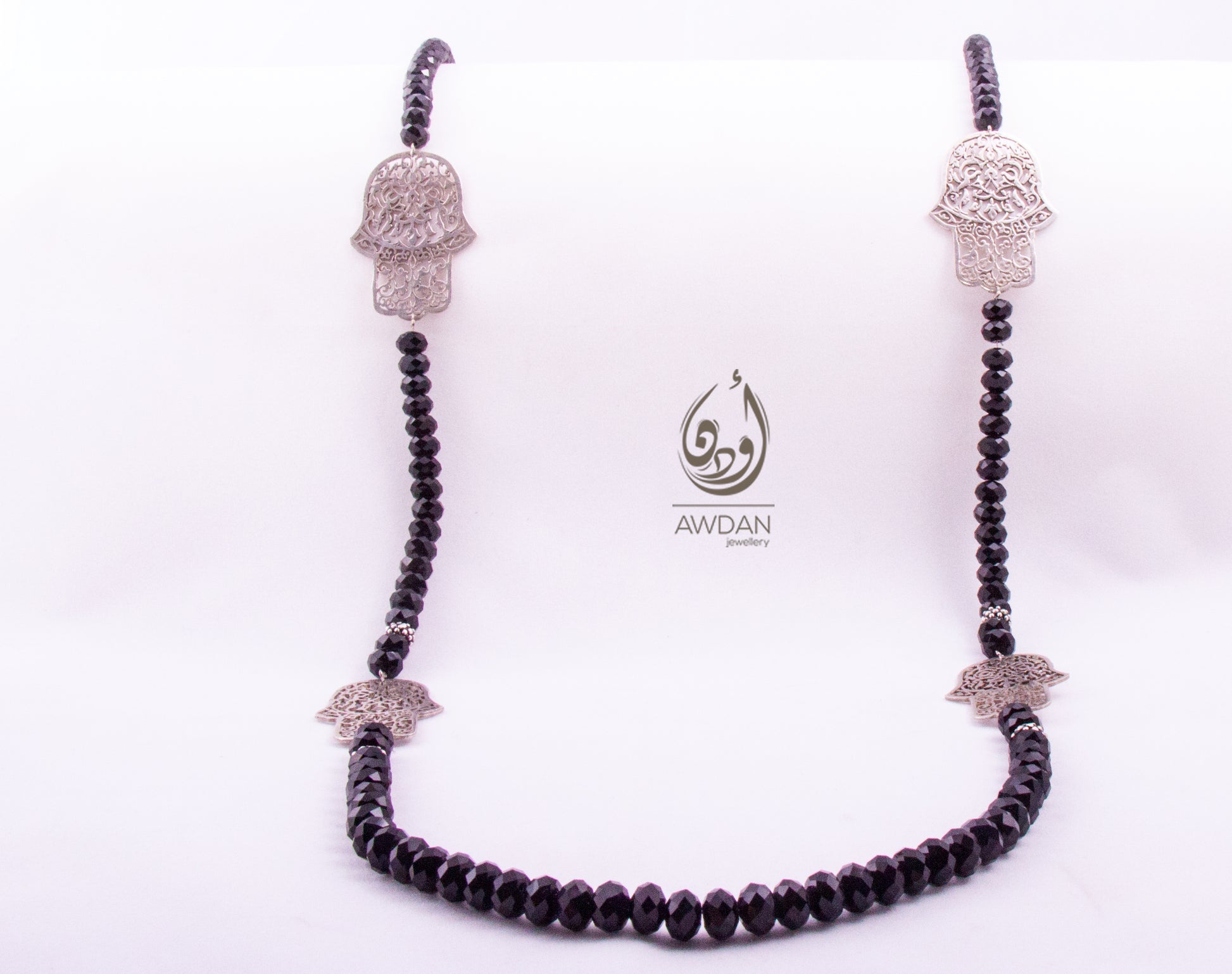 Elevate your style with this stunning long beaded necklace, thoughtfully designed with four intricately crafted tribal patterned hand charms. Each charm brings a unique cultural touch, while the delicate beads create a graceful flow that complements any outfit. Perfect for adding a distinctive, artistic flair to your look, this necklace blends tradition with modern elegance effortlessly. Embrace a bold accessory that speaks to your individuality and enhances your everyday wear. Available in White Pearls and in Black Crystals.