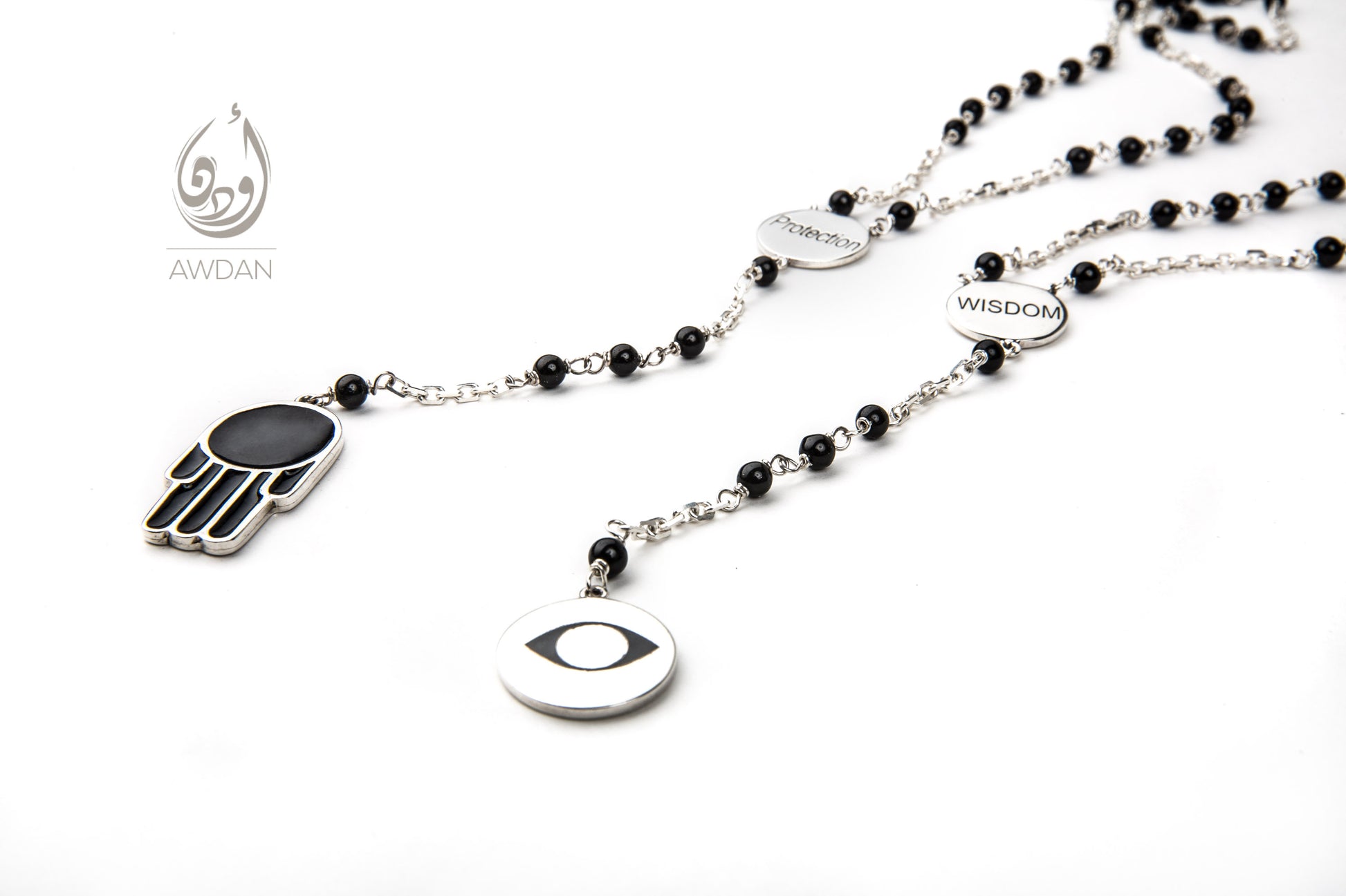 This handcrafted necklace features elegant wired onyx stones paired with durable sterling silver chains. Choose between engraved coin options symbolizing wisdom or protection, complemented by a distinctive hand or eye charm for added meaning. Designed for those who appreciate both style and symbolism, this piece offers a sophisticated accessory with thoughtful details.