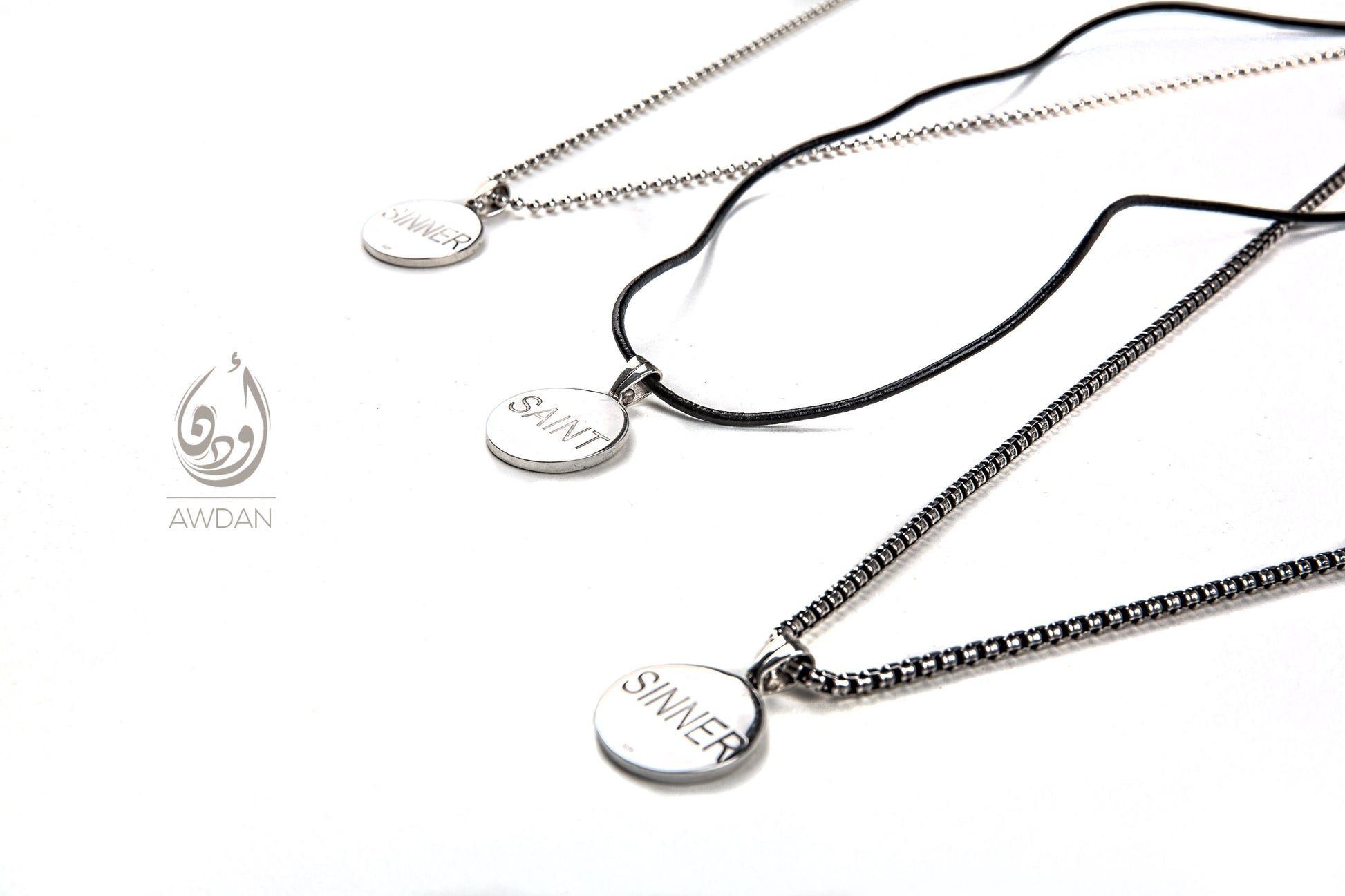 This sterling silver necklace features a unique flipping coin pendant engraved with "SAINT" on one face and "SINNER" on the other. Expertly crafted for seamless movement, the pendant offers a symbolic expression of duality and personal identity. The polished sterling silver ensures durability and a sleek finish, making this piece both a meaningful accessory and a conversation starter.