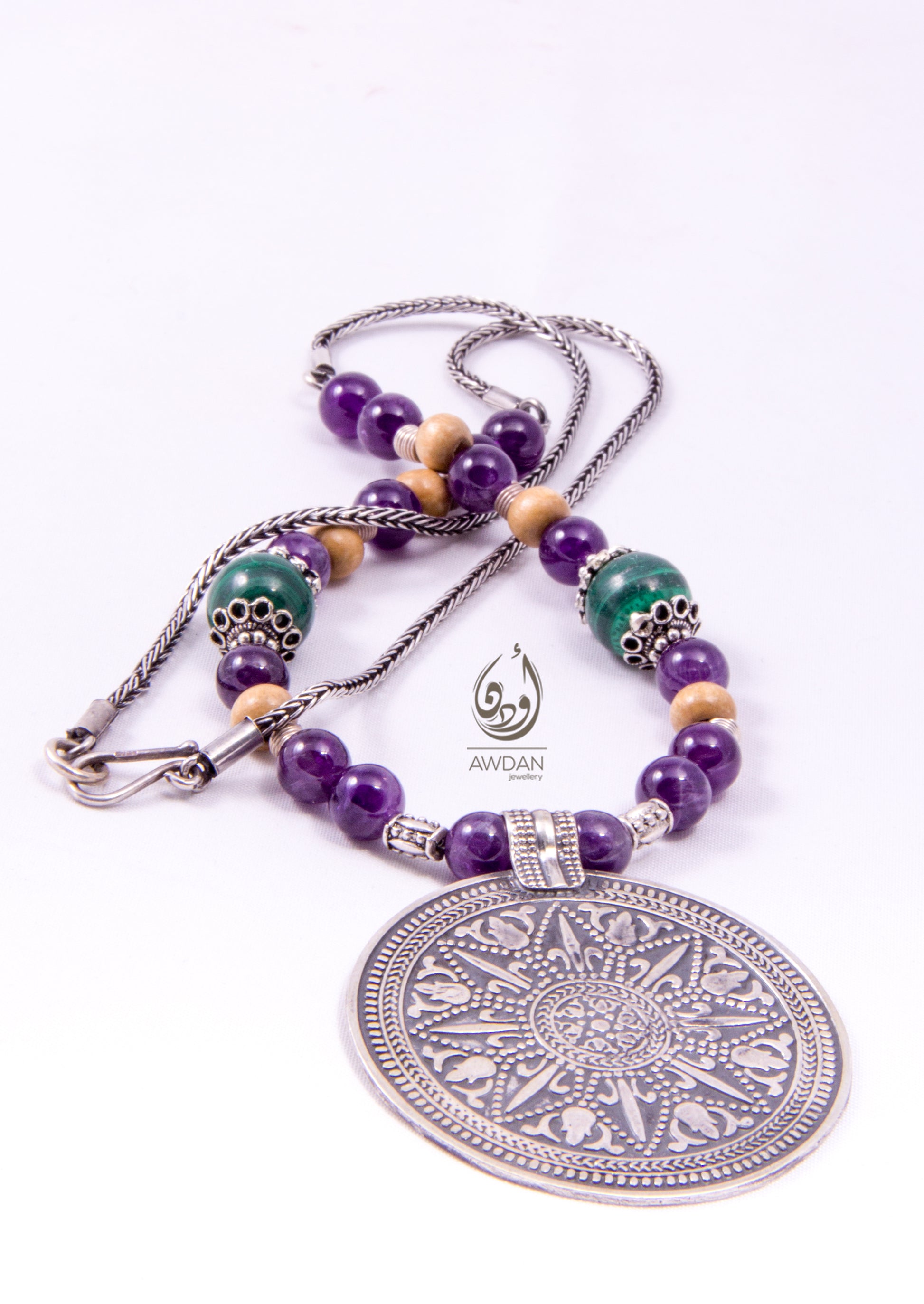 This captivating bohemian necklace features a prominent tribal coin pendant suspended from a unique half multi-stone, half silver chain. Combining the rich green malachite, soothing amethyst, and natural wood beads with sleek silver accents, it offers a striking balance of earthy tones and metallic shine. Perfect for those seeking an artistic and bold accessory, this necklace adds a distinct cultural touch and elevates any ensemble with effortless style and personality.